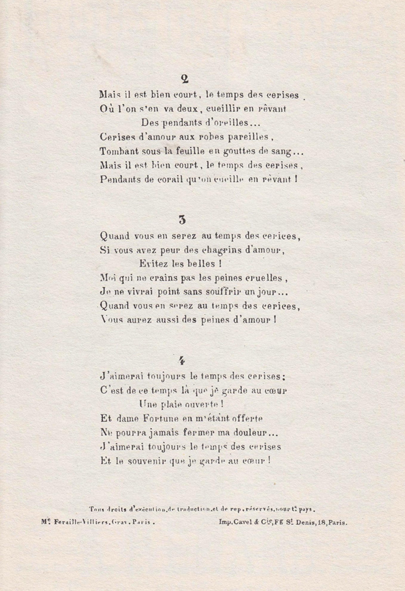 Quelle que soit sa petite histoire, "Le temps des cerises", à l'origine sous-titrée "romance", figurerait au tout premier plan dans n'importe quel palmarès de dix des plus grandes chansons françaises.