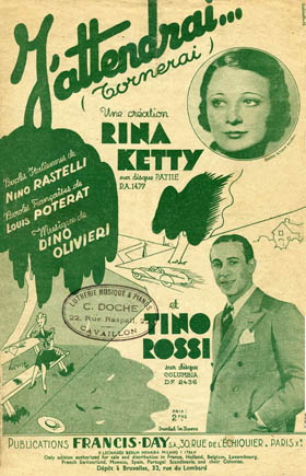 Quelques mois plus tard Tino Rossi en fit un enregistrement puis Jean Sablon, l'année suivante, Jean Sablon qui allait la garder à son répertoire jusqu'à sa mort. - "Toute ma vie, j'ai chanté "J'attendrai..."dans le monde entier", a-t-il écrit. "J'ai même dû apprendre à la chanter en japonais. Partout [elle fut] tenue pour une chanson typiquement française." - Au départ, pourtant, elle était effectivement italienne ("Tornerai" - 1937 - paroles de Nino Rastelli, musique de Dino Olivieri, sur un air inspiré de Madame Butterfly de Puccini). - Un certain Jacques Larue la traduisit presque immédiatement en français sous le titre de "Soirs d'amour" et c'est à Jean Sablon que revint l'honneur de la créer mais sans trop de succès, aux États-Unis. - Et voici que Louis Poterat en fit une autre adaptation, et voici qu'une italienne, immigrée en France, s'en empara. - Quand Sablon revint de l'Amérique, il s'en empara à son tour. - L'italienne s'appelait Rina Ketty.
