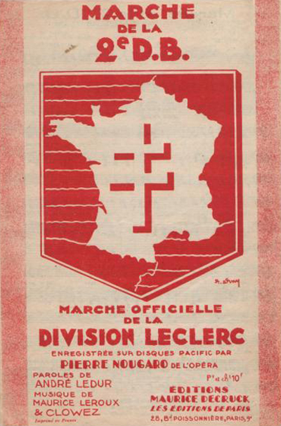 Nous terminerons, notre série audio, par ce fameux air (paroles d'A. Ledur et musique de V. Clowez), "La Marche de la 2ème D.B". Accompagnement : orch. militaire (dir.capitaine Félix Boyer) :