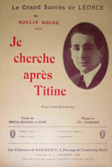 Sa notoriété devint mondiale grâce à sa célèbre chanson qui deviendra "The Nonsense Song" (Voir à notre rubrique La chanson française du Temps des cerises aux Feuilles mortes en 50 chansons, au numéro 27) "Je cherche après Titine" (1917) "empruntée" par Charlie Chaplin pour le film Les Temps modernes en 1936, qui l'avait remarquée en 1922 lors de son passage à Paris, . D'ailleurs, faute d'avoir déposé les droits de la chanson aux États-Unis, Léo Daniderff ne touchera rien, dans un premier temps, sur l'exploitation de sa musique chez les Américains, mais il intente et gagne un procès qui lui permet d'être rétabli dans ses droits et d'encaisser 500 000 francs.