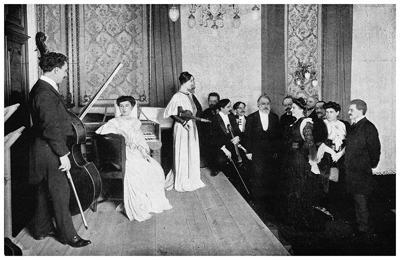 (paru dans Paris qui Chante du 26 mars 1905) La légende précise : "Mlle Yvette Guilbert - Personnalités du monde musical allemand entourant la chanteuse française dans un salon de Berlin."
