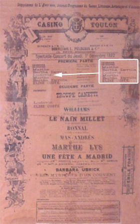 Il s'agit de la toute première représentation de Mayol dans sa ville natale, le 1er décembre 1892 (sous le nom du Petit Ludovic) - le quatrième nom à partir du haut :