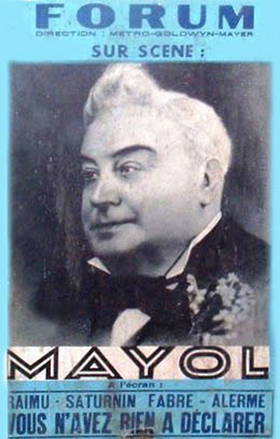 Note : les deux dernières affiches faisaient partie de la collection de feu Monsieur André Faure-Mayol, la dernière datant des premières représentations du film de Léo Joannon, Vous n'avez rien à déclarer (avec, entre autres Georgius), au Forum en 1937. Entre deux représentations, Mayol y allait de son tour de chant. Il avait alors 65 ans. L'autre date d'avant la guerre 14-18 : Mayol était chez lui, au Concert Mayol, naturellement.