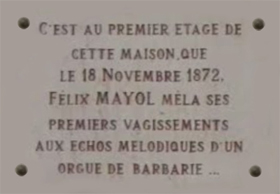 Suit une photo de la plaque apposée sur la maison où Félix Mayol naquit le 18 novembre 1872, au 13 rue d'Isly, à Toulon :