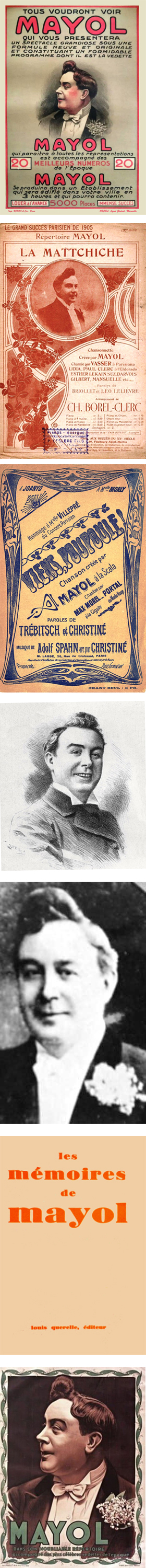 Comme il le dit lui-même dans ses Mémoires - sans insister sur son immense popularité (particulièrement entre 1900 et 1914) - , quelques éditeurs sans scrupule, en province ou ailleurs, n'ont pas hésité à apposer le nom de Mayol sur divers titres sans nécessairement mentionner "à la manière" ou dans son style.