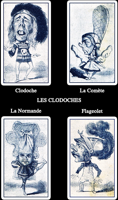 Les Clodoches, c'étaient quatre jeunes gens de Paris, grands amateurs et pratiquants de danse excentrique, qui avaient imaginé un nouveau quadrille, lequel avait fait fureur aux bals de l'Opéra, puis aux Variétés dans L'œil crevé. De simples amateurs, dansant à Mabille, au Prado, au Casino Cadet, chez Markowski et partout, ils étaient devenus des professionnels. Deux d'entre-eux étaient costumés en femmes La Comète et La Normande, car pour ne pas troubler l'harmonie de leur entreprise, ils s'étaient passés de la collaboration de grandes cancaneuses du jour, la célèbre Rigolboche, Alice la Provençale, Finette, Rasalba-Cancan [on écrit également : Rosalba-Cancan], Nini belles-dents, etc.