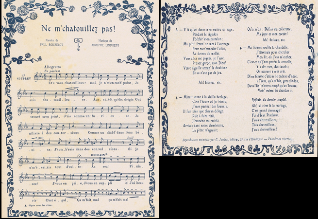 Alcazar. C'était "J'suis Chatouilleux !" [Francis Tourte et Victor Robillard, 1869] Il s'agissait d'un jeune paysan bébête qui contait les péripéties de sa nuit de noces. J'avais travaillé mon personnage avec ardeur et trouvé un effet qui fut énorme et me valut ce succès auquel j'aspirais et que je n'avais pu encore décrocher depuis mon entrée aux Ambassadeurs. Je répétais plusieurs fois avec une sorte de gloussement joyeux : sa jupe et son corset oh ! oh ! oh ! et je finissais par un éclat de rire, en gamme chromatique, tellement contagieux que le public se tordait littéralement.