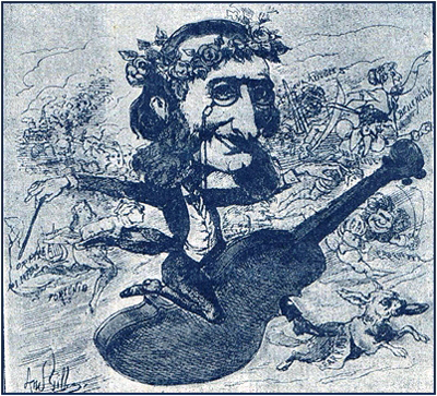 Après "Les Cocardiers", de retentissante mémoire [voir au chap. 7], il fallait servir un autre pétard aux oreilles blasées des Toulousains. J'avais déniché ce pétard, sous la forme d'une chanson satirique, inspirée par les événements que la France venait de subir. Elle avait pour titre les Blagueurs ! L'auteur était Philibert [parolier des Pompiers de Nanterre] qui avait déjà produit un nombre de chansons à succès, et la musique, fort belle, de A. Dubost [V'là l'tramway qui passe], un compositeur plein de verve et d'idées qui, sous son nom ou sous le pseudonyme de Byrec [La femme athlète, Je suis pocharde...], a fait quantité d'œuvres charmantes et applaudies.