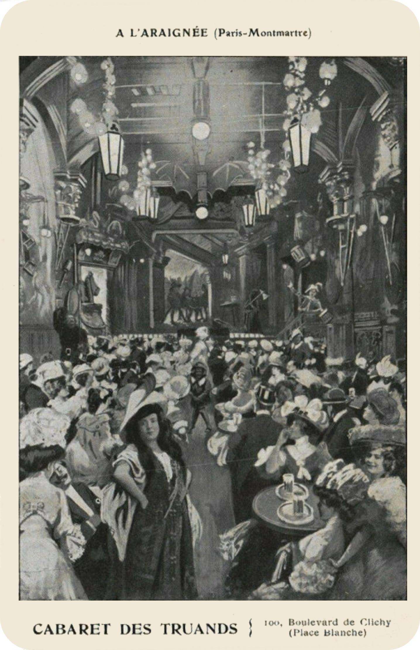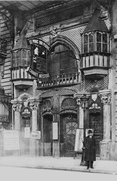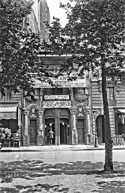 Tout commence par la réception d'une image en provenance d'une amie d'Alsace. La photographie empruntée sur le site est légendée Palais de la Chanson, sans autre précision. Une recherche sur le web ne produit aucune occurrence. Ne reste plus qu'à agrandir le cliché pour en déchiffrer les banderoles et détails architecturaux. Nous finissons par reconnaître l'établissement du n° 100 du Boulevard de Clichy dans le 18e arrondissement de Paris. Tour à tour, la Truie qui file, Taverne des Truands, Cabaret des Truands, L'Araignée, Cabaret du Porc qui Pique, Cabaret Alexandre, Palais de la Chanson, L'Epatant, Les Truands, Les Métèques, Les Deux Ânes... Ouf !