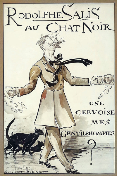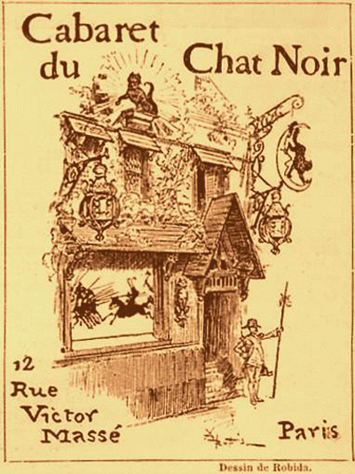 En novembre 1881, donc, ouverture du cabaret Le Chat Noir, par Rodolphe Salis, peintre médiocre mais homme d'affaires génial, assisté d'Emile Goudeau, chef de file des poètes agitateurs "Hydropathes", devenus les Hirsutes qui s'ancrent au Chat Noir avec notamment Charles Cros poète et inventeur qui séduit l'auditoire avec ses calembours.Un ancien bureau des Postes, tout en longueur et étroit, redécoré qui n'accueille ni anarchiste ni révolutionnaire, mais des amateurs de facéties ouverts à toutes les chimères. Le succès est immédiat ! L'aventure dure 16 ans, avec des collaborations multiples, des brouilles et des réconciliations. L'accueil n'est pas agressif.
