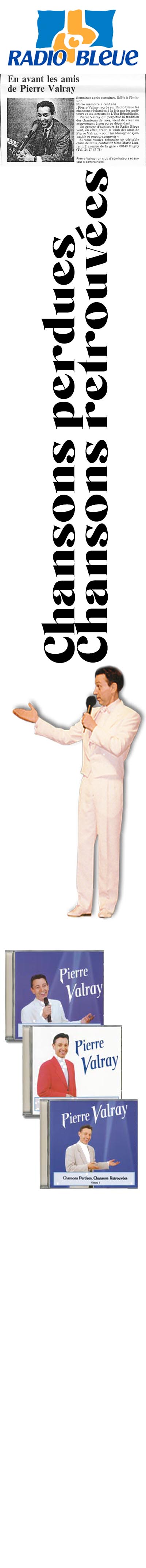 endant ces dix années, sur Radio Bleue, dans l'émission radiophonique, Notre Mémoire a cent ans, le mercredi entre dix heures et onze heures,Pierre Valray et son complice le pianiste René Baugé †, recréent les chansons réclamées par les auditeurs et les lecteurs de certains titres de la PQR [*]. C'est la séquence Chansons perdues... Chansons retrouvées, qui donnait à entendre des chants et ritournelles disparus et qui a fait les beaux jours de Radio Bleue... À un point tel qu'un Club regroupant les admiratrices du chanteur s'est créé !
