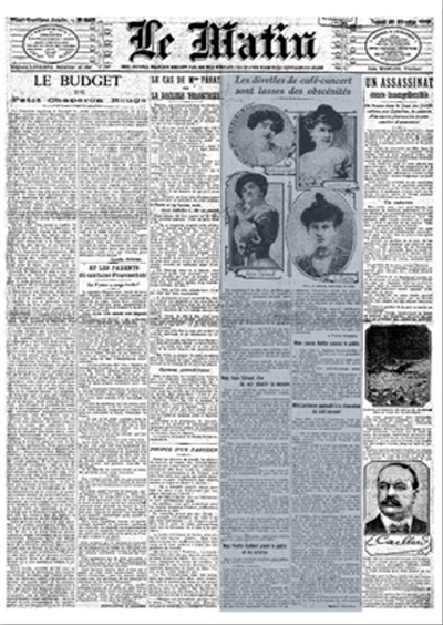 - Le "beuglant" sans cochonneries ? (sic)... Oh ! c'est simple, ça ne fera pas un sou. On chantera devant les banquettes. Ce genre de spectacle est, tel qu'on le présente, parfaitement adéquat à l'état moral de notre société actuelle. Songez un peu à la mentalité des auditeurs, et vous trouverez que les couplets qu'on leur "dégoise" sont innocents comme des cantiques.