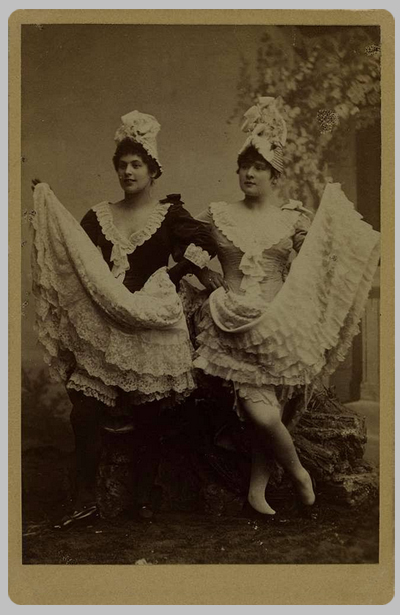 La Goulue, d'abord, qu'on a aussi appelé Vide-Bouteille, est née Louise Weber, à Clichy-la-Garenne (75 - Seine aujourd'hui 92 - Hauts-de-Seine), le 12 juillet 1866. Adolescente, elle sèche les fonds de verre dans les cabarets des fortifs.Tous les soirs, elle fait les bals vêtue des effets "empruntés" aux clientes de la blanchisserie de sa mère. Elle raconte avec fierté avoir perdu sa fleur à l'âge de treize ans. Elle débute en blanchisseuse, vend des fleurs puis devient modèle. Elle se prostitue très vite, fréquente le Grand Véfour, l'Alcazar d'Hiver, l'Élysée Montmartre où Oller la remarque et l'engage tout de suite pour son Moulin Rouge (en 1889). - Elle y restera six ans, devenant la plus célèbre des danseuses de l'endroit mais très vite elle se prend pour la reine de Paris, affiche un caractère insupportable, se fait photographier dans des nus scandaleux (voir ci-dessous) et insulte, dans un vocabulaire à faire frémir des soldats, la clientèle. - On raconte qu'elle aurait même dit au Prince de Galles, en visite incognito : "Hoé, Galles, tu paies le champagne ce soir ?"