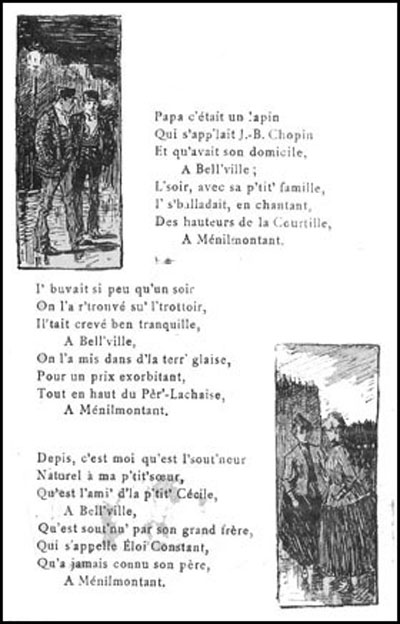 En 1885, sa silhouette n'a pas encore atteint la notoriété que les affiches de Toulouse-Lautrec allaient lui conférer sept ans plus tard (et qui en contrepartie, allaient assurer la première notoriété de Toulouse-Lautrec) mais, s'étant essayé l'année précédente avec "À la Villette"[*], il entame toute une série de chansons ayant pour titres le nom des quartiers de Paris où il décrit les bonheurs, misères et préoccupations des petites gens, non sans une certaine démagogie et non sans une certaine facilité mais, de ces chansons, le "Belleville-Ménilmontant", que nous proposons ici comme quatrième titre, n'est pas sans une certaine poésie, de cette poésie, hélas, souvent oubliée par les littérateurs (et ce, depuis Villon) - Un chef-d'œuvre ? Sans doute pas, mais... pas loin.