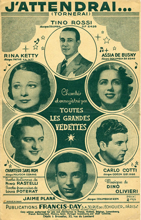 Quelques mois plus tard Tino Rossi en fit un enregistrement puis Jean Sablon, l'année suivante, Jean Sablon qui allait la garder à son répertoire jusqu'à sa mort. - "Toute ma vie, j'ai chanté "J'attendrai..."dans le monde entier", a-t-il écrit. "J'ai même dû apprendre à la chanter en japonais. Partout [elle fut] tenue pour une chanson typiquement française." - Au départ, pourtant, elle était effectivement italienne ("Tornerai" - 1937 - paroles de Nino Rastelli, musique de Dino Olivieri, sur un air inspiré de Madame Butterfly de Puccini). - Un certain Jacques Larue la traduisit presque immédiatement en français sous le titre de "Soirs d'amour" et c'est à Jean Sablon que revint l'honneur de la créer mais sans trop de succès, aux États-Unis. - Et voici que Louis Poterat en fit une autre adaptation, et voici qu'une italienne, immigrée en France, s'en empara. - Quand Sablon revint de l'Amérique, il s'en empara à son tour. - L'italienne s'appelait Rina Ketty.