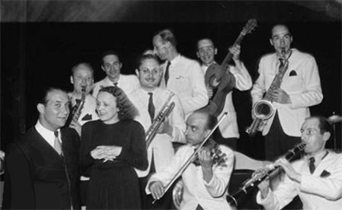 Edith Piaf, Fred Adison et son orchestre lors d'une collecte de fonds au Gaumont Palace