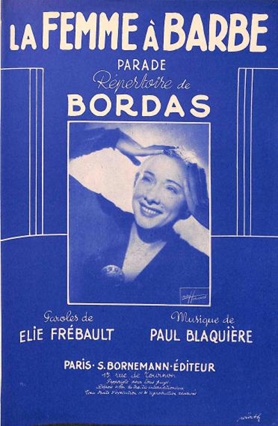 Marcelle Bordas débute en 1933 au Casino de Cabourg dans un répertoire composé de "La femme à barbe" - le grand succès de Thérésa 1865 - Paroles d'Élie Frebault, musique de