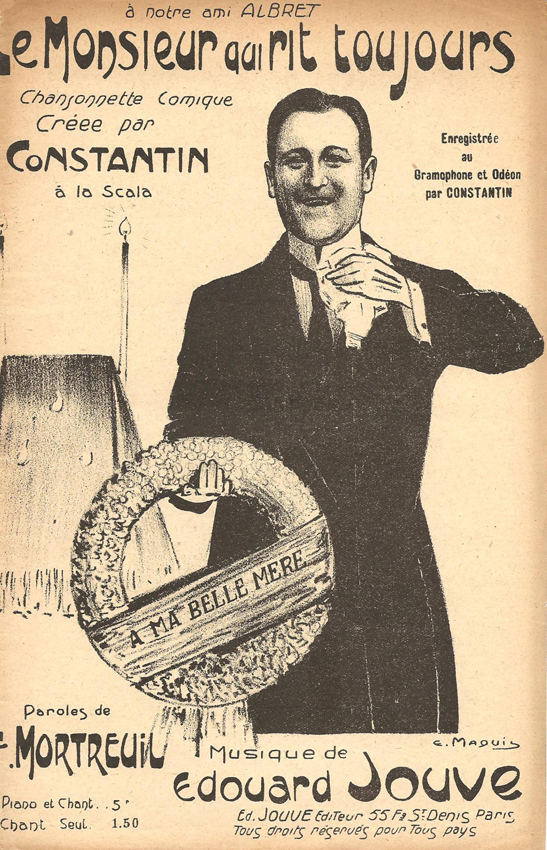 dans ses mémoires [1], mentionne en 1946,que Constantin, a tenu un temps un comptoir d'huîtres et de coquillagesdans le faubourg Saint-Martin qu'il a transformé par la suite encomptoir de vente de tickets de loterie... Marc Béghin † nous signale, quantà lui, que Constantin (le Rieur) est né Constantin Collet, en Belgique, le 13 juin 1875 et qu'il est décédé à Paris le 4 octobre 1949.