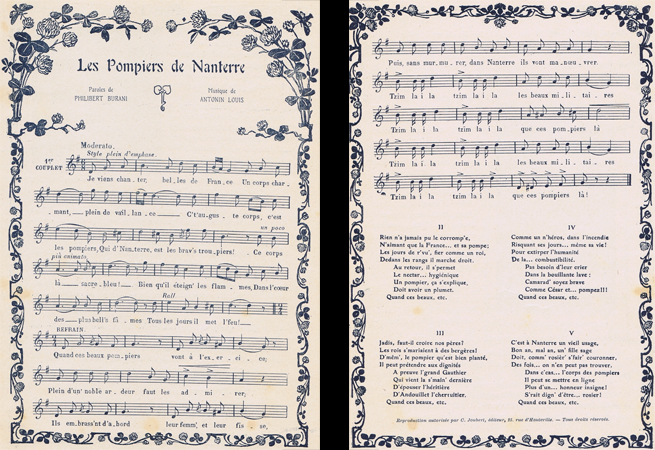 C'était la fête à Nanterre. J'étais le capitaine des pompiers ; je les passais en revue, les faisant manœuvrer ; je les interrogeais, les haranguais et je chantais les couplets. Tous les artistes reprenaient en chœur le refrain et ça se terminait par un quadrille monstre, chahuté à l'instar des Clodoches qui avaient alors un succès fou dans toute la France.