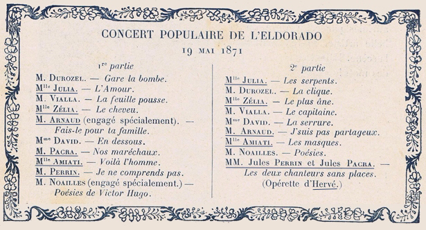 Le 15 mai 1871, Perrin, de l'Eldorado, craignant que ce concert ne fût réquisitionné pour les ambulances, - ce qui était le sort d'un grand nombre de théâtres - Perrin s'en fut trouver son camarade