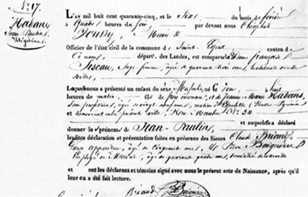 Son prénom n'était pas Jean-Paul mais Jean-Paulin ; qu'il n'est pas né dans une famille de "petits commerçants" - rumeur qu'il a lui-même lancée et entretenue toute sa vie - mais bien d'un père inconnu ; que Habans était le nom de sa mère, née Jeanne-Marie, à Espelette,(64 Basses-Pyrénées, aujourd'hui 64 - Pyrénées-Atlantiques) sans profession. - Tous ces renseignements que l'on peut relever sur son acte de naissance que nous a fait parvenir Philippe Beau (Merci Monsieur Beau !).