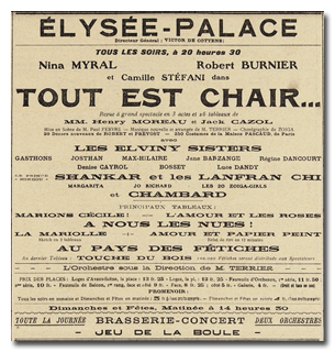 Le journal de Vichy du 8 août 1926, l'annonce à l'Elysée-Palace dans la revue en 3 actes et 26 tableaux de Henry Moreau et Jack Cazol Tout est chair...