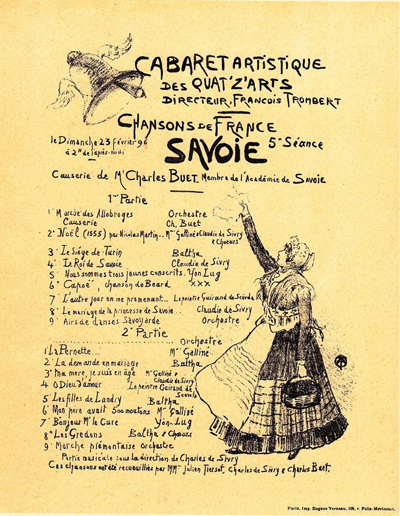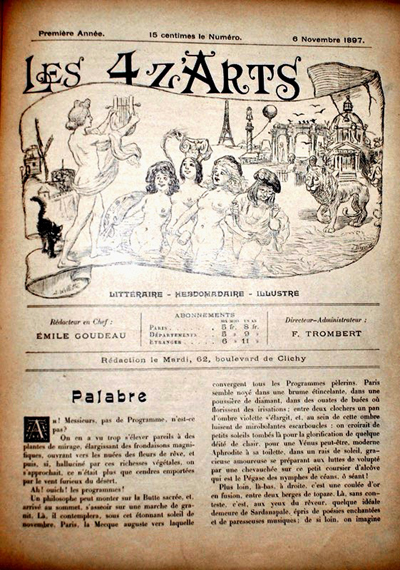 Entre tous les cabarets artistiques le CABARET DES QUAT'Z'ARTS a su se faire une place sous le soleil éclatant de Montmartre.Comme son nom l'indique, tout en portant haut et ferme le drapeau de la chanson, ce cinquième art, il est reste le centre de réunion de tout ce qui pense et exécute dans ce cerveau du monde.Fondé sous les auspiceset avec le concours des principaux Chansonniers de Montmartre, LE CABARET DES QUAT'Z'ARTS n'a pas trompé les espérances nées autour de son berceau. Successivement Meusy, Sécot, Tiercy, Hector Sombre, Delmet, Fragson, Lemercier, Marcel Lefevre, Edmond Teulet, Mme France, Marcel Legay, Trimouillat, Yon-Lug, Paul Daubry, Varney,Montoya, Numa Blès sont venus y faire consacrer et définir leur talent et leur réputation.