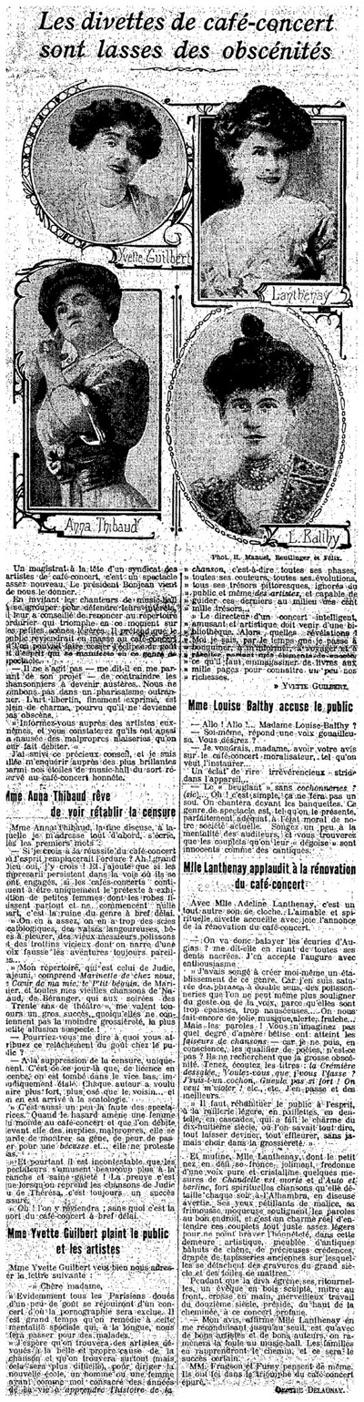 - Le "beuglant" sans cochonneries ? (sic)... Oh ! c'est simple, ça ne fera pas un sou. On chantera devant les banquettes. Ce genre de spectacle est, tel qu'on le présente, parfaitement adéquat à l'état moral de notre société actuelle. Songez un peu à la mentalité des auditeurs, et vous trouverez que les couplets qu'on leur "dégoise" sont innocents comme des cantiques.