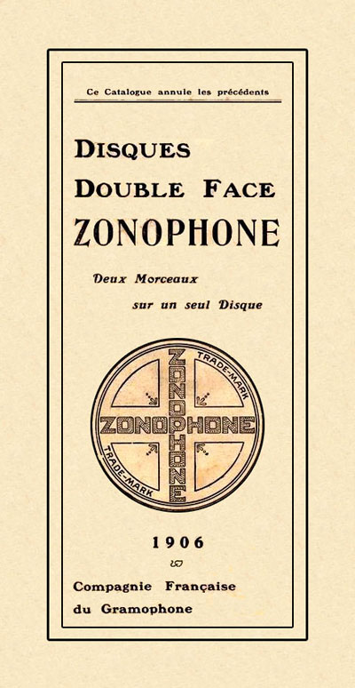 ous trouverez ci-dessous le catalogue des disques double face pour phonographes Zonophone, tel qu'édité en 1906. Ce catalogue, quoiqu'il donne une idée précise de ce que la Gramophone Company distribuait en 1906 - et sous quel format - est plus une curiosité qu'une véritable référence. Pour plus de détails, if faut consulter le "His Master's voice / La voix de son maître, The French Catalogue" d'Alan Kelly publié par la Greenwood Press en 1990 grâce aux archives de la EMI (EMI Music Archives, London) qui comprend tous les titres enregistrés sous l'étiquette Gramophone de 1899 à 1929 en France, et de 1920 à 1929, en Belgique (y compris ceux enregistrés sous l'étiquette Zonophone de 1904 à 1912).