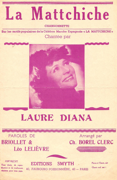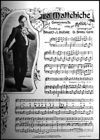 Viens, Poupoule !", et les "Mains de femmes", voici sans doute le plus grand des succès de Mayol. Les paroles de cette chanson - osées pour l'époque (enfin...) - nous font aujourd'hui sourire. - "La Matchiche" demeure cependant, presque cent ans après sa création, la chanson la plus connue de la Belle Époque, celle qu'on fredonne encore quand on pense au French Cancan, au Moulin Rouge, aux affiches de Toulouse-Lautrec ; celle qui symbolise dans les bandes sonores des films hollywoodiens le Gay Paree des Mistinguett et des Maurice Chevalier. - Elle n'est pourtant que de Mayol, n'a été chantée que par lui [*] et elle demeure à tout jamais, dans l'esprit de ceux qui ont connu Mayol, une chanson écrite pour Mayol, dans le style Mayol et pour un public Mayol même si Fragson en a fait une presque-copie.